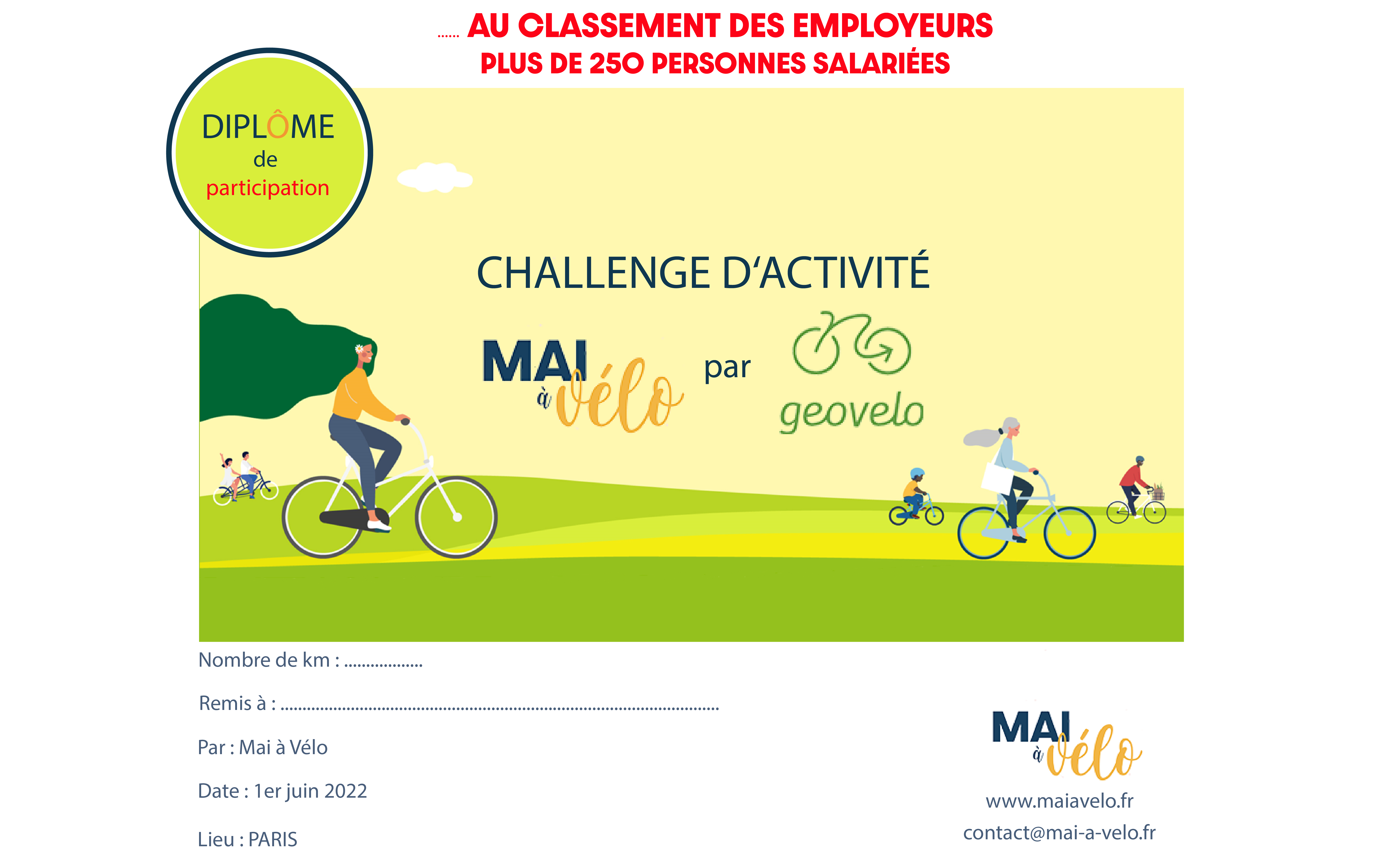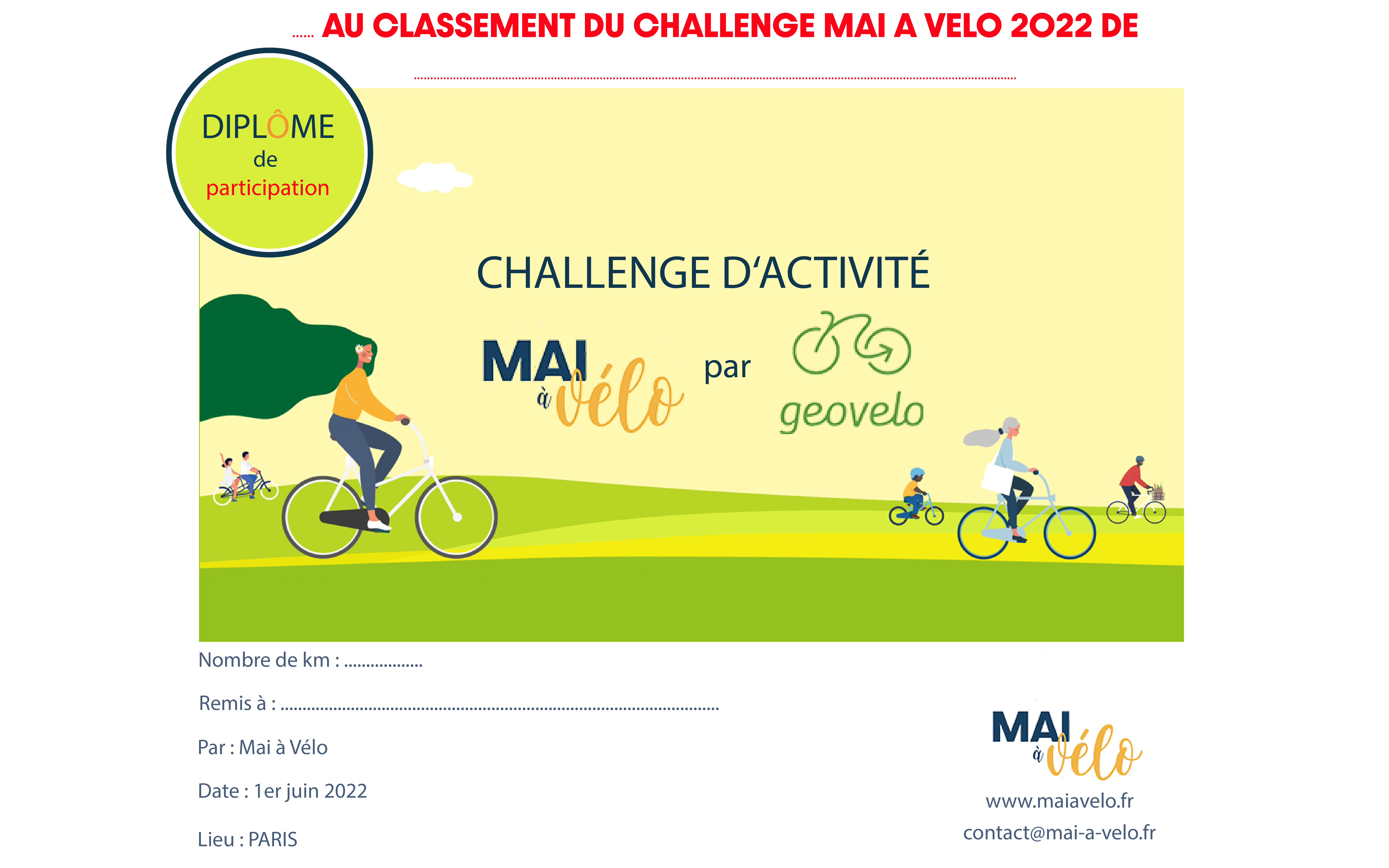 LES DIPLÔMES DE PARTICIPATION AU CHALLENGE D’ACTIVITE MAI A VELO PAR GEOVELO DU MOIS DE MAI 2022